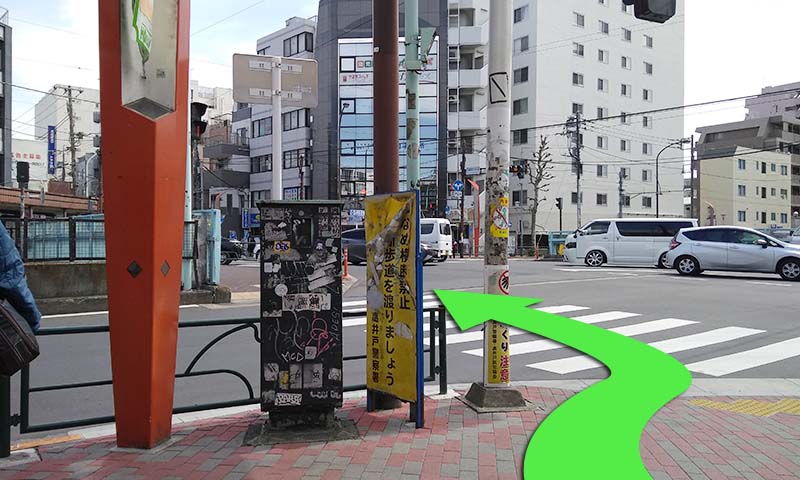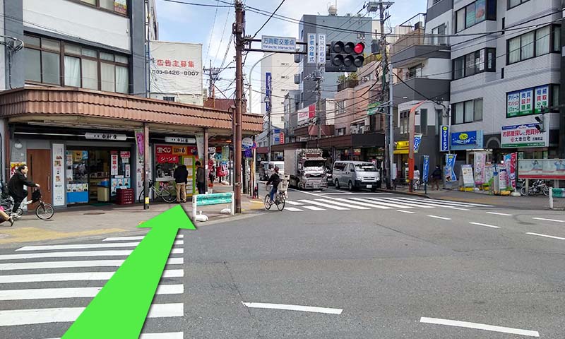 駅出口目の前に、交差点がございます。横断歩道を進み陸橋を渡ってください。